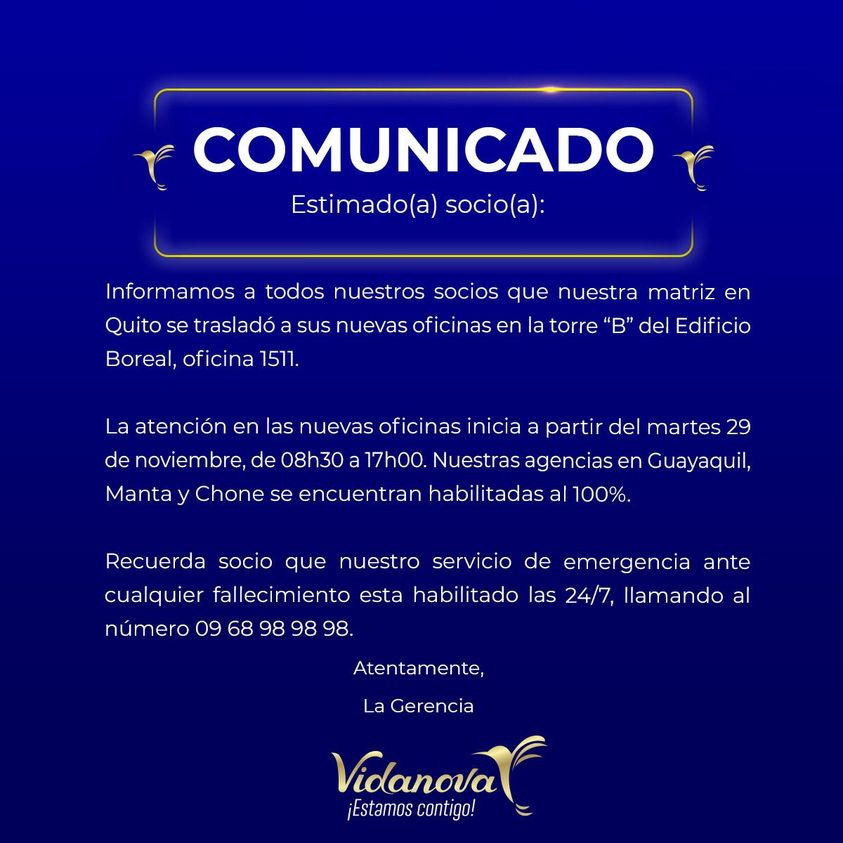 Socio Vidanova contamos con nuevas oficinas en la ciudad de Quito. Visítanos en el Edificio Boreal, Torre B, oficina 1511. Av. 12 de Octubre y Av. Colón.